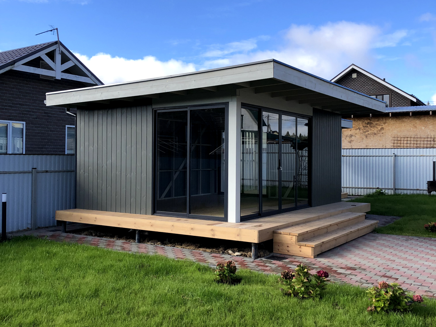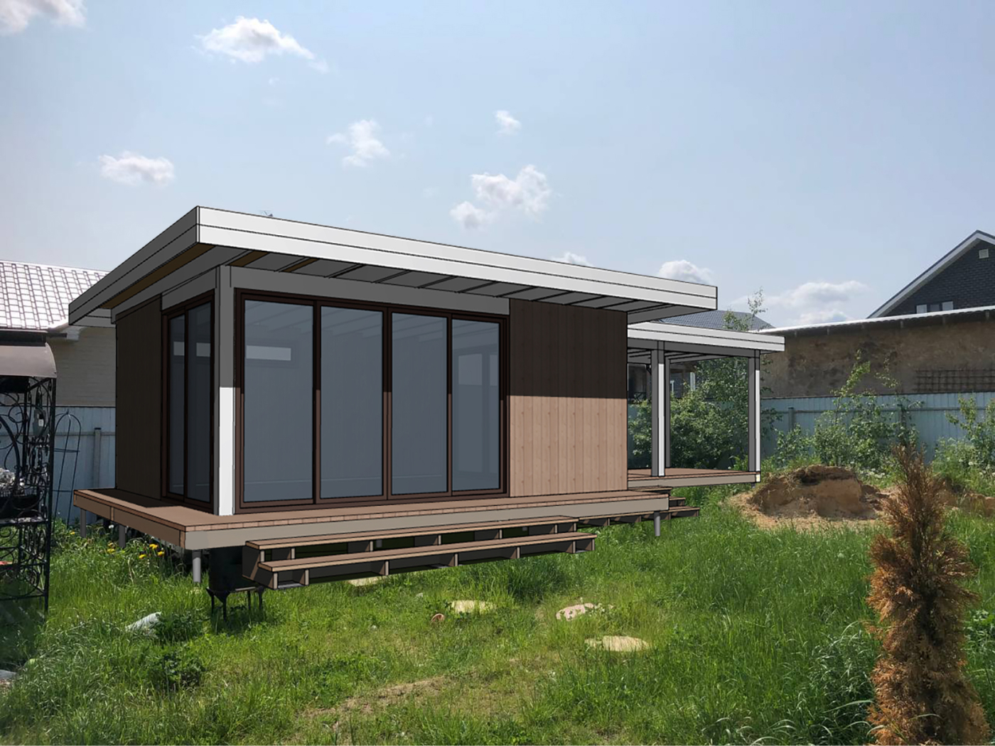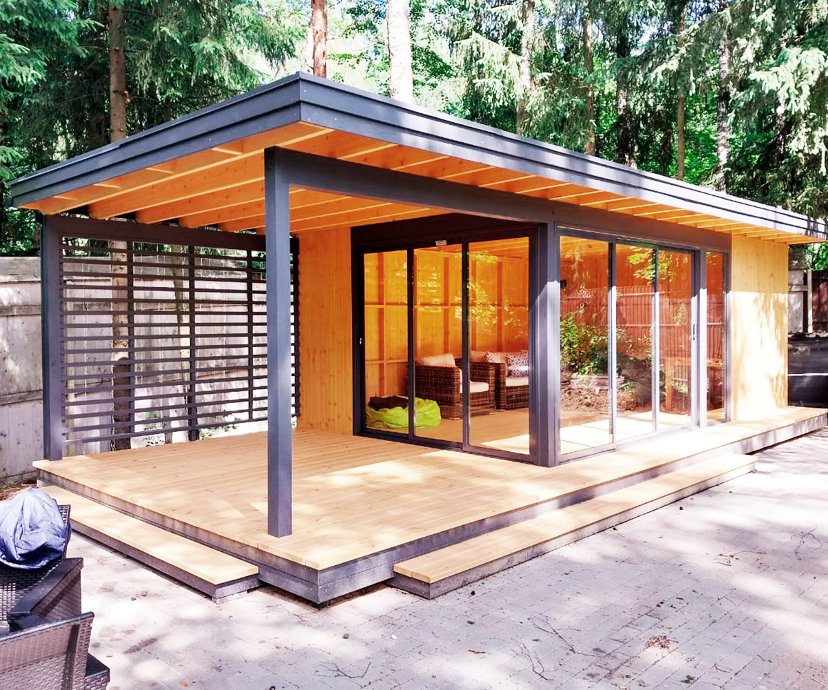 Особенности и дополнения: Покраска по выкрасам заказчика в цвет построенного дома, электрика, жалюзийная решетка из лиственницы, увеличенный свес кровли.
